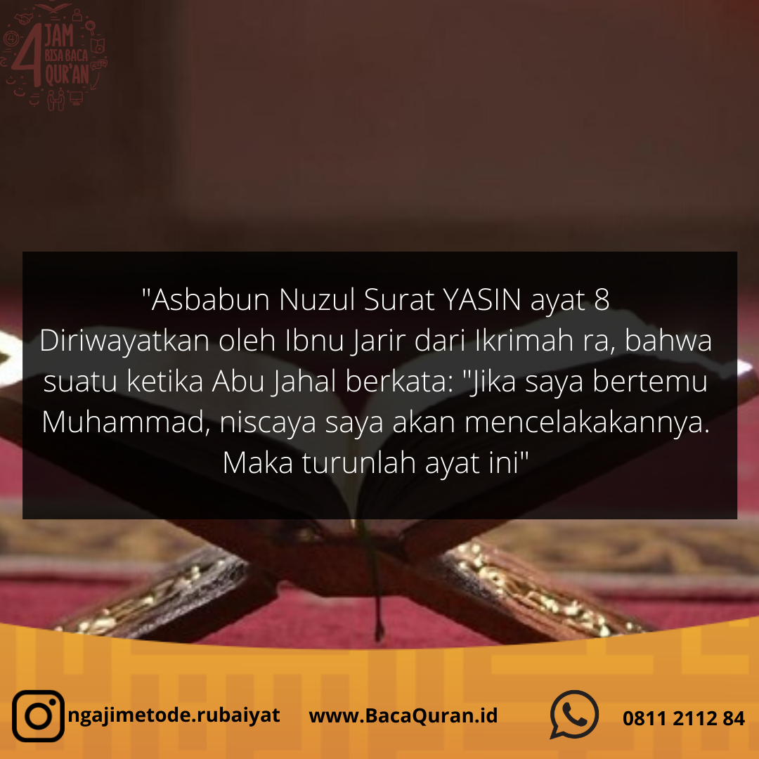 “Sekiranya aku bertemu dengan Muhammad, pasti aku akan berbuat (mencelakainya).” Maka Allah ﷻ menurunkan ayat, “Sesungguhnya Kami telah memasang belenggu di leher mereka, lalu tangan mereka (diangkat) ke dagu, maka kerana itu mereka tertengadah. Dan Kami adakan di hadapan mereka dinding dan di belakang mereka dinding (pula), dan Kami tutup (mata) mereka sehingga mereka tidak dapat melihat.” (Yasin: 8-9) Ketika Nabi Muhammad ﷺ berada di sekitar Abu Jahal, orang-orang menunjukkan bahawa Muhammad ﷺ berada di sisinya. Akan tetapi Abu Jahal tetap bertanya-tanya: “Mana dia?” kerana tidak dapat melihatnya. Diriwayatkan oleh Qurthubi رَحِمَهُ اللَّهُ.