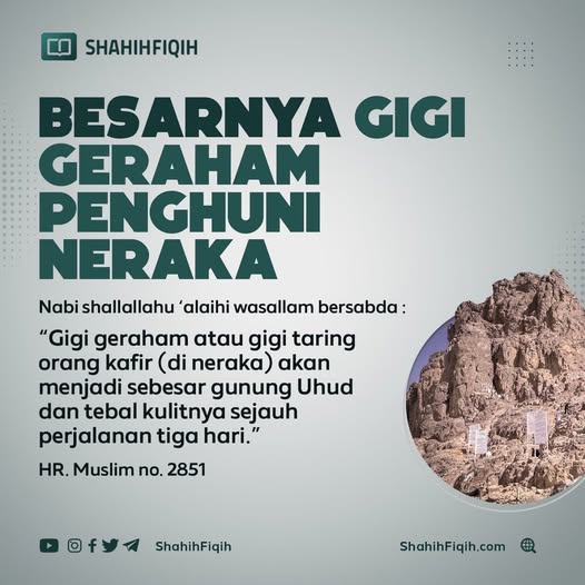 Untuk membayangkan berapa besar badan kita nanti, bayangkan sebatang gigi kita sama besar dengan Gunung Uhud. Tempat bersila sahaja, sebesar tiga hari perjalanan dengan unta. Muka kita akan ditebalkan setebal 42 hasta. Walaupun sudah tebal kulit kita, tetapi apabila air yang diberi minum kepada penghuni neraka nanti diletakkan sahaja air itu pada muka, tersiat bibir kita ke atas dan ke bawah disebabkan oleh panasnya air itu. Inilah cerita pasal neraka yang jarang diketahui. Apabila tidak mengetahui keadaan tentang neraka, maka kita tidak rasa takut kepada neraka.