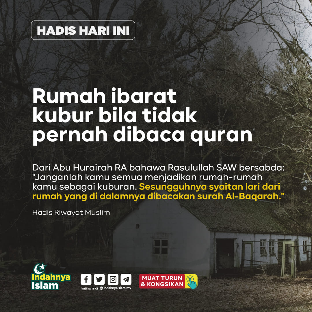 “Janganlah menjadikan rumah kamu seperti perkuburan, sesungguhnya syaitan lari dari rumah yang dibaca padanya surah al-Baqarah”.