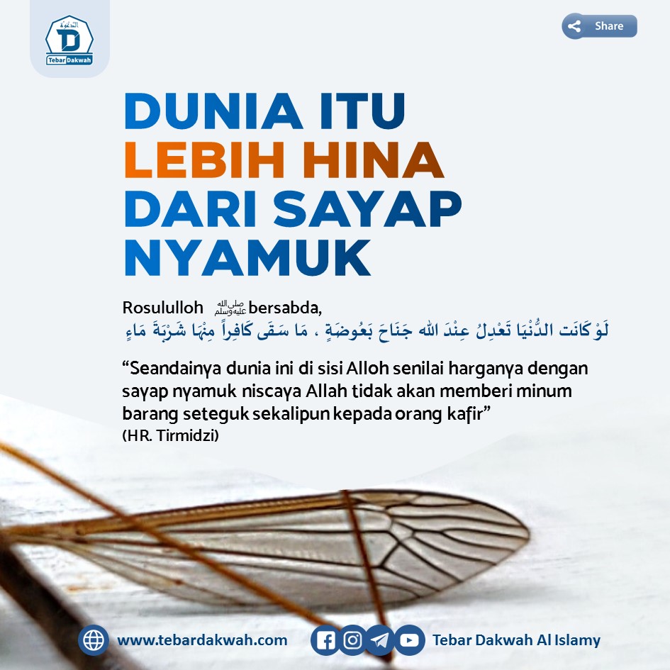 Daripada [Sahl bin Sa’d رَضِيَ اللّٰهُ عَنْهُ] dia berkata, “Kami pernah bersama Rasulullah ﷺ di Dzul Hulaifah, tiba-tiba ada seekor kambing mati dengan kaki terangkat, maka baginda pun bersabda: “Bukankah kalian melihat bahawa hal ini merupakan suatu yang hina bagi pemiliknya? Demi Dzat yang jiwaku berada di tangan-Nya, sungguh dunia itu lebih hina di hadapan Allah daripada (bangkai) ini atas pemiliknya, sekiranya dunia itu memiliki nilai seberat sayap nyamuk di sisi Allah, nescaya Dia tidak akan memberikan setitis pun terhadap orang kafir.”