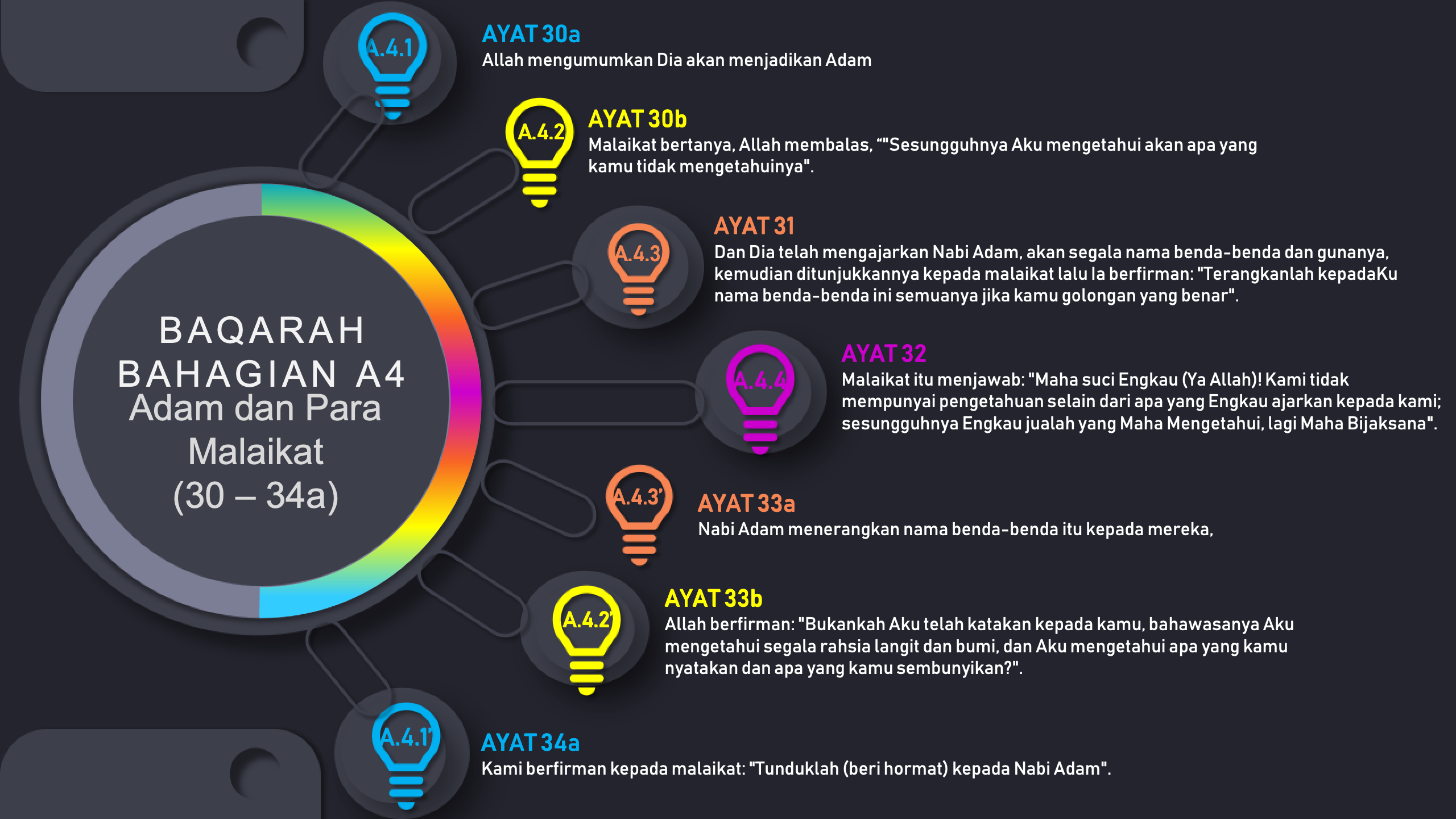 [A4.1]/[A4.1’] – Di dalam bahagian ini, disebut bahawa penciptaan manusia dan pelantikannya sebagai Khalifah di bumi telah diiktiraf oleh para Malaikat apabila mereka sujud kepada Nabi Adam عَلَيْهِ ٱلسَّلَامُ.