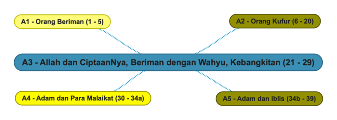 [A1]/[A2] – Kalau kita melihat secara horizontal, dua bahagian pertama itu mengandungi dua perkara yang berlawanan yang menjadi cermin antara satu sama lain (Orang Beriman dan Orang yang Kufur). Di dalam setiap bahagian kita akan melihat sifat-sifat Orang Beriman dan kemudian kita telah melihat sifat-sifat yang kufur.