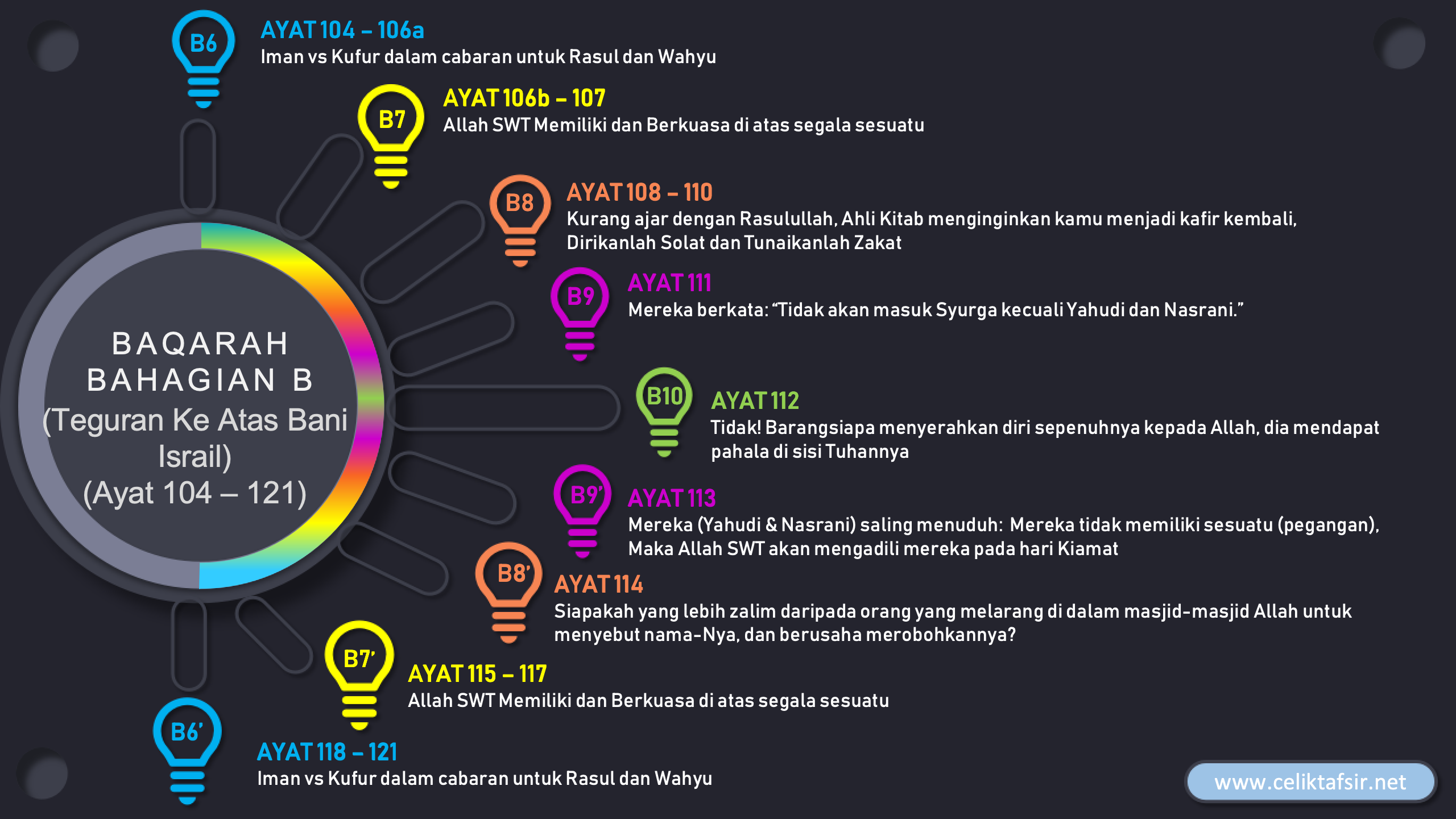 [B6]/[B6’] – Kedua-dua bahagian di dalam cincin luar ini menyebut tentang keraguan, pengejekan dan kedegilan Bani Israil. Sepatutnya mereka beriman dengan wahyu, namun sebaliknya mereka tanya soalan-soalan bodoh, menghina suruhan dan enggan masuk agama Islam.