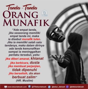 “Ada empat tanda, jika seseorang memiliki empat tanda ini, maka ia disebut munafik tulen. Jika ia memiliki salah satu tandanya, maka dalam dirinya ada tanda kemunafikan sampai dia meninggalkan perilaku tersebut, iaitu: jika diberi amanat, khianat; jika berbicara, dusta; jika membuat perjanjian, tidak dipenuhi; jika berselisih, dia akan berbuat zalim.”