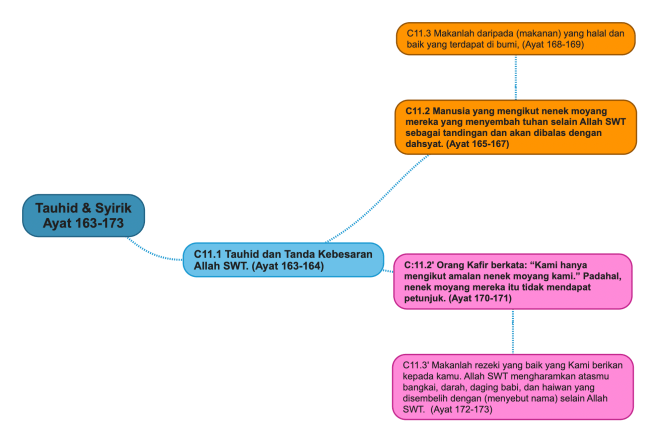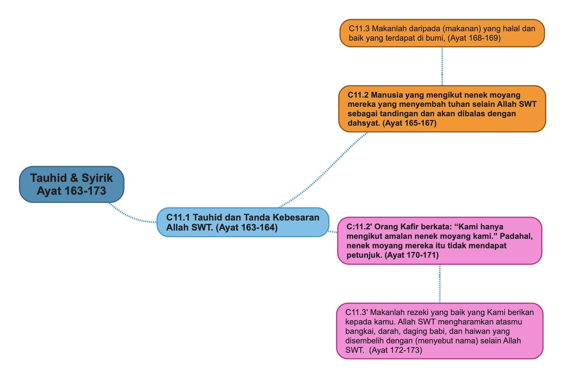 Penerangan: Setelah Allah ﷻ menyuruh manusia berpegang dengan Tauhid dan meninggalkan syirik, Allah ﷻ telah memberi dalil dan tanda-tanda bukti kenapa hanya Allah ﷻ sahaja yang layak disembah [C11.1]. Akan tetapi manusia ada satu masalah besar yang menghalang mereka iaitu mereka berpegang dengan amalan dan ajaran tok nenek mereka yang kita boleh perhatikan di dalam [C11.2] dan diulang sekali lagi di dalam [C11.2′]. Maka Allah ﷻ memberi ubat bagi masalah itu iaitu makan daripada makanan yang halal dan baik yang Allah ﷻ telah berikan seperti disebut di dalam [C11.3] dan [C11.3′]