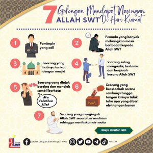 Daripada Abu Hurairah رَضِيَ اللّٰهُ عَنْهُ, daripada Nabi ﷺ baginda bersabda, “Tujuh golongan yang dinaungi Allah dalam naungan-Nya pada hari di mana tidak ada naungan kecuali naungan-Nya: (1) Imam (pemimpin) yang adil, (2) pemuda yang menyibukkan dirinya dengan ibadah kepada Allah, (3) seorang yang hatinya selalu terikat ke masjid, (4) dua orang yang saling mencintai di jalan Allah, keduanya berkumpul kerana-Nya dan berpisah kerana-Nya, (5) seorang laki-laki yang diajak berzina oleh seorang wanita yang mempunyai kedudukan lagi cantik, lalu dia berkata, ‘Sesungguhnya aku takut kepada Allah.’ Dan (6) seseorang yang bersadaqah dengan satu sadaqah lalu dia menyembunyikannya sehingga tangan kirinya tidak tahu apa yang diinfaqkan tangan kanannya, serta (7) seseorang yang berzikir kepada Allah dalam keadaan sepi lalu dia menitiskan air matanya.”
