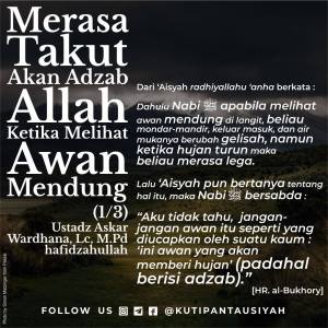 Sesungguhnya Rasulullah ﷺ apabila melihat awan mendung di langit, beliau mundar-mandir, keluar masuk, dan air mukanya berubah gelisah, namun ketika hujan turun maka beliau menjadi lega. Lalu ‘Aisyah رضي الله عنها pun bertanya tentang hal itu, maka Nabi ﷺ bersabda: Aku tidak tahu, jangan-jangan awan itu adalah seperti yang diucapkan oleh suatu kaum.“Ini awan yang akan memberi hujan (sedangkan ia adalah azab buat mereka).