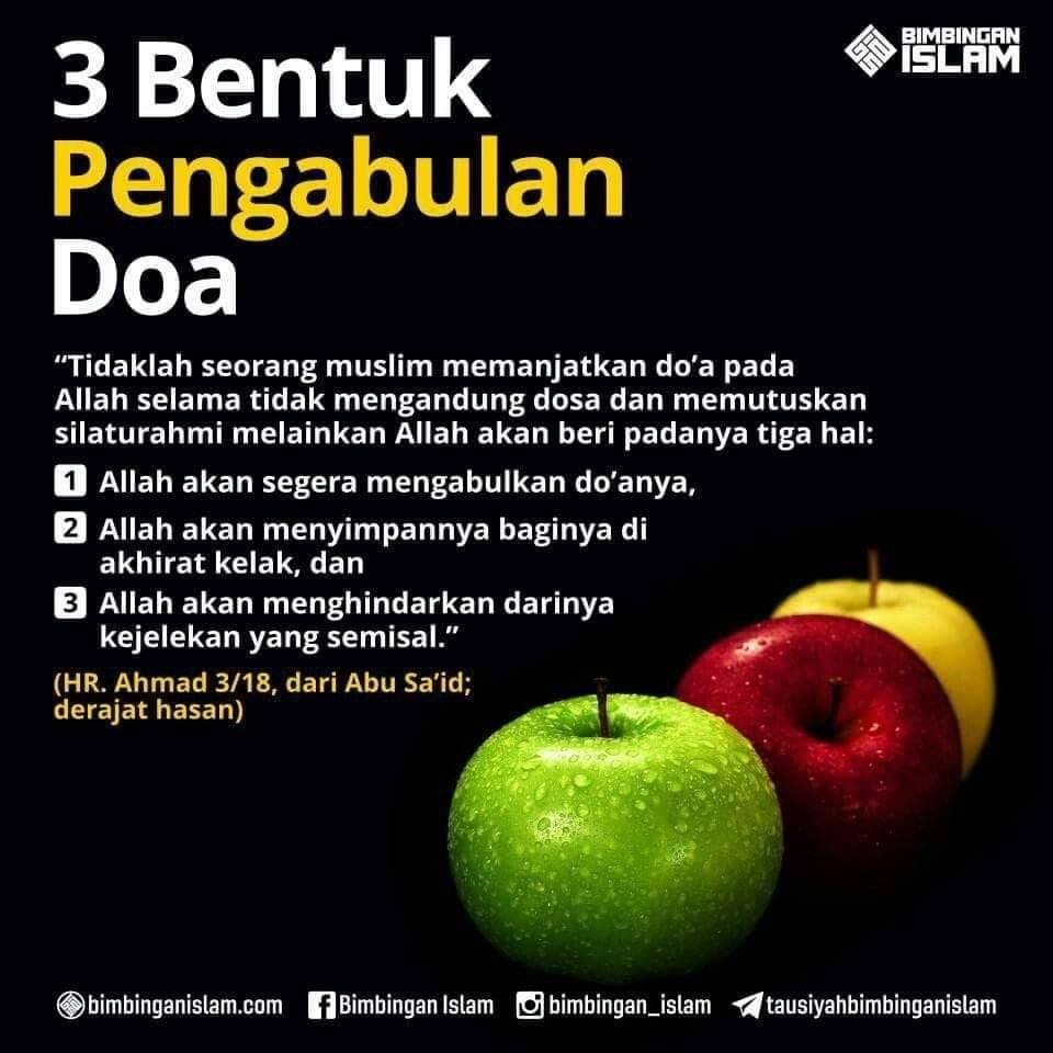 “Tidaklah seorang muslim memanjatkan doa pada Allah selama tidak mengandung dosa dan memutuskan silaturahmi (antar kerabat, pen) melainkan Allah akan beri padanya tiga hal: [1] Allah akan segera mengabulkan doanya, [2] Allah akan menyimpannya baginya di akhirat kelak, dan [3] Allah akan menghindarkan daripadanya kejelekan yang semisal.” Para sahabat رضي الله عنهم lantas mengatakan, “Kalau begitu kami akan memperbanyak berdoa.” Nabi ﷺ lantas bersabda, “Allah nanti yang memperbanyak mengabulkan doa-doa kalian.”