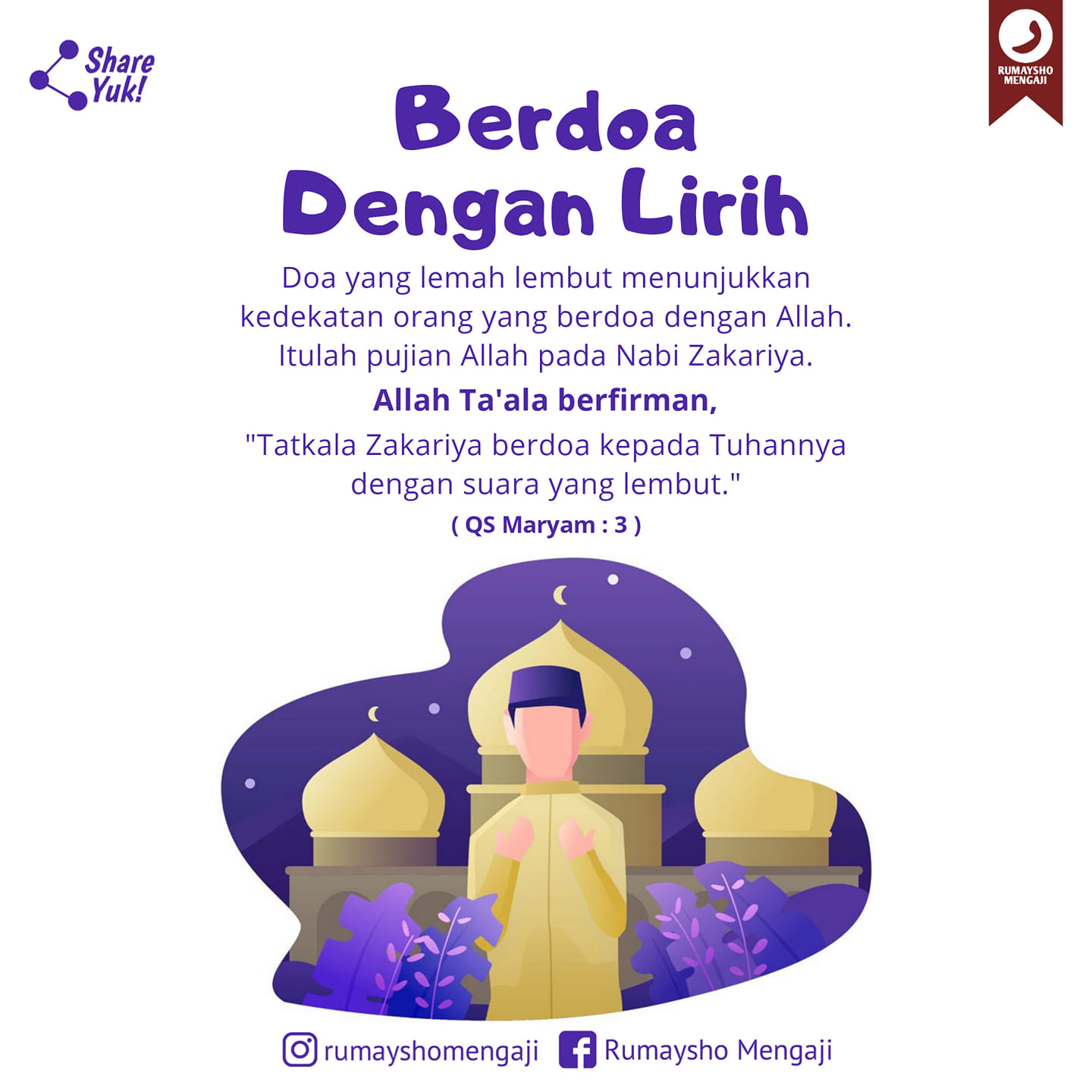 Lihatlah bagaimana cara doa Nabi Zakariya عَلَيْهِ ٱلسَّلَامُ apabila baginda berdoa (dan doa baginda dimakbulkan, bukan?) di dalam Maryam: 3