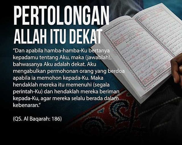 Dan apabila hamba-hamba-Ku bertanya kepadamu mengenai Aku maka (beritahu kepada mereka): sesungguhnya Aku (Allah) sentiasa hampir (kepada mereka); Aku perkenankan permohonan orang yang berdoa apabila dia berdoa kepada-Ku. Maka hendaklah mereka menyahut seruanKu (dengan mematuhi perintahKu), dan hendaklah mereka beriman kepada-Ku supaya mereka menjadi baik serta betul.