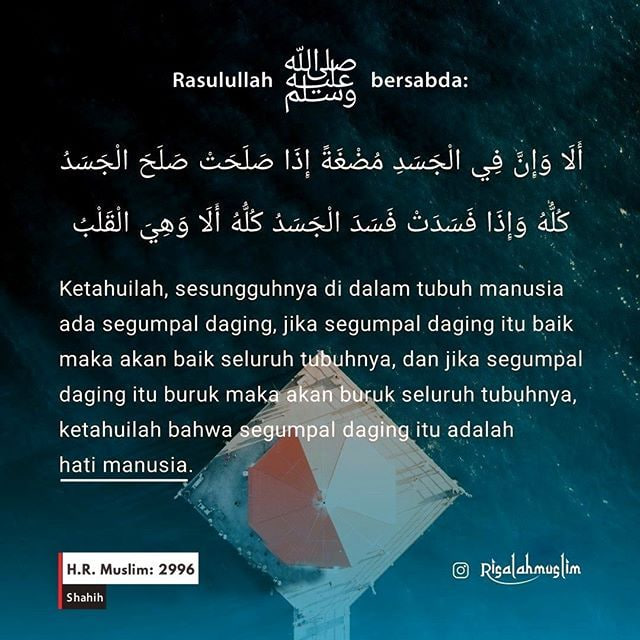 “Ketahuilah bahawa dalam jasad ada seketul daging, apabila baik maka baiklah jasad, apabila rosak maka rosaklah jasad. Ketahuilah ia adalah hati!”