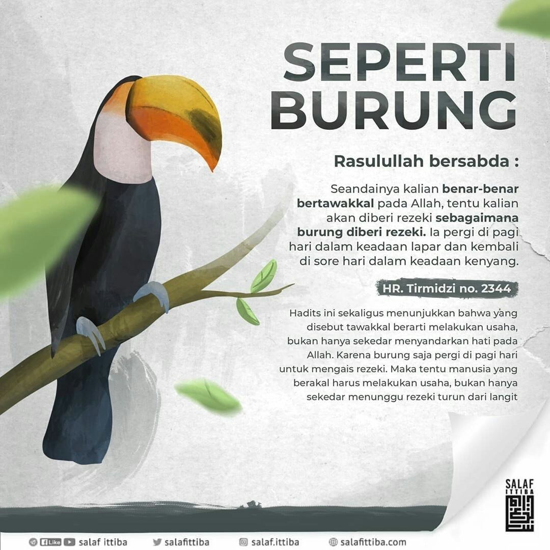 [Umar Bin Al Khathab] menerangkan bahawa dia mendengar Nabiyullah ﷺ bersabda: “Jika kalian bertawakal kepada Allah ﷻ dengan sebenar-benarnya tawakal, nescaya Dia akan memberikan rezeki kepada kalian, sebagaimana Dia telah memberikan rezeki kepada burung yang berangkat di pagi hari dalam keadaan kosong dan kembali dalam keadaan kenyang.”