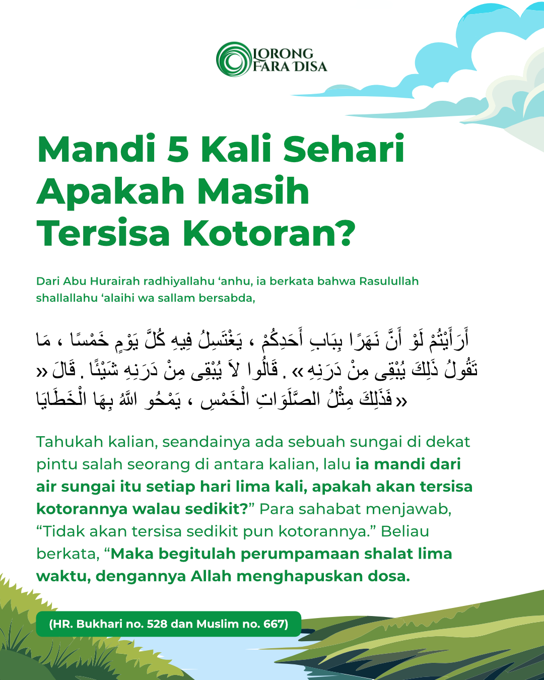 Daripada Abu Hurairah رَضِيَ اللّٰهُ عَنْهُ, bahawa dia mendengar Rasulullah ﷺ bersabda: “Bagaimana pendapat kalian seandainya ada sungai di depan pintu rumah salah seorang daripada kalian, lalu dia mandi lima kali setiap hari? Apakah kalian menganggap masih akan ada kotoran (daki) yang tersisa padanya?” Para sahabat menjawab, “Tidak akan ada yang tersisa sedikit pun kotoran padanya.” Lalu baginda bersabda: “Seperti itu pula dengan solat lima waktu, dengannya Allah akan menghapus semua kesalahan.”
