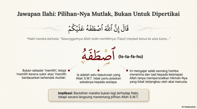 Di sini juga mengajar kita yang Allah ﷻ yang berhak melantik sesiapa yang dikehendaki-Nya, maka tidak boleh buat apa lagi. Allah ﷻ tidak perlu hendak beri penjelasan kepada mereka kenapa Dia pilih Talut. Siapa mereka yang Allah ﷻ kena ikut pula?