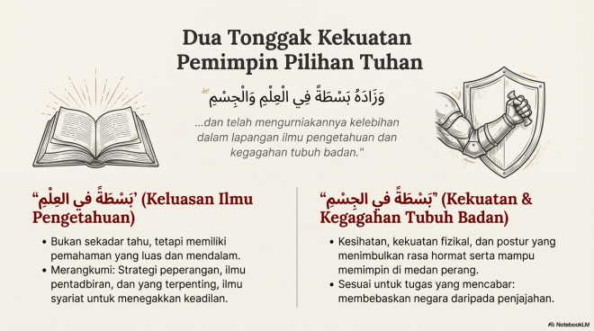Akan tetapi ia menjadi dalil bagi kita bahawa ketua kerajaan dan ketua perang mestilah terdiri daripada orang yang berilmu dan ada kekuatan tubuh badan. Mereka mestilah daripada orang yang layak berjuang dan juga layak memimpin. Lebih-lebih lagi jika hendak memerintah ketika zaman yang mencabar seperti hendak membebaskan negara daripada penjajahan. Takkan hanya bergantung kepada seorang pemimpin yang lembik?