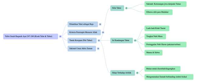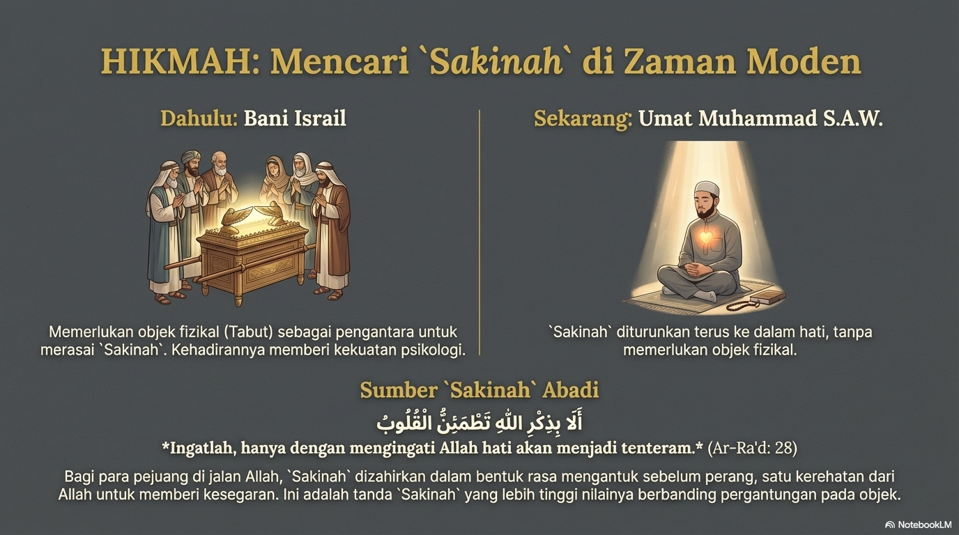 Tabut itu sesuai sebagai tanda pada zaman itu, tetapi kepada Nabi akhir zaman dan umatnya, tidak diberikan sakinah sebegitu. Kita akan belajar nanti bagaimana Nabi Muhammad ﷺ dan umatnya juga ada diberikan dengan Sakinah tetapi di dalam bentuk yang lain. Sakinah itu akan diberikan kepada setiap mujahidin sebelum memulakan peperangan. Ia dalam bentuk angin bayu yang lembut yang akan diberikan kepada mujahidin sampai mereka jadi mengantuk. Ini adalah tanda Allah ﷻ beri sakinah. Sebelum Allah ﷻ beri, jangan mulakan takbir perang.