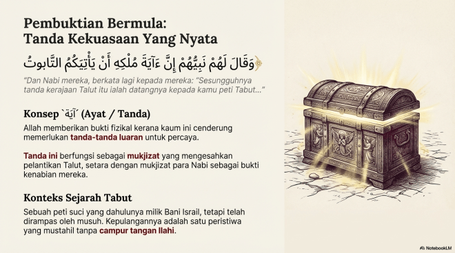 Dan Nabi mereka berkata lagi kepada mereka: “Sesungguhnya tanda kekuasaan Talut itu ialah datangnya kepada kamu peti Tabut