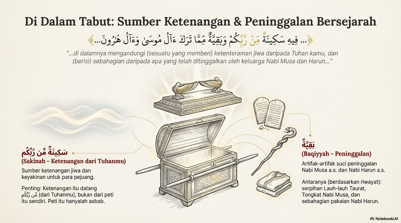 Di dalam peti itu ada ketenteraman kepada mujahid semasa perang. Namun perhatikan sakinah itu daripada Allah (مِن رَّبِّكُم), bukannya daripada peti itu. Apabila peti itu ada bersama, mereka berasa mereka mendapat bantuan daripada Allah ﷻ. Ketenteraman itu bukan daripada peti itu tetapi daripada Allah ﷻ. Dengan adanya Tabut itu, memberi ketenangan kepada mereka untuk berjuang dan ia hanyalah dalam bentuk psikologi sahaja.
