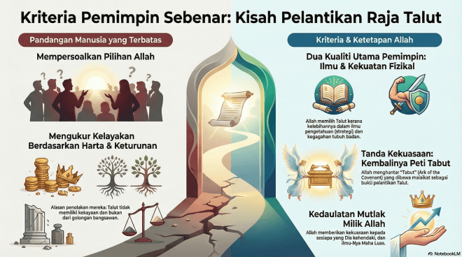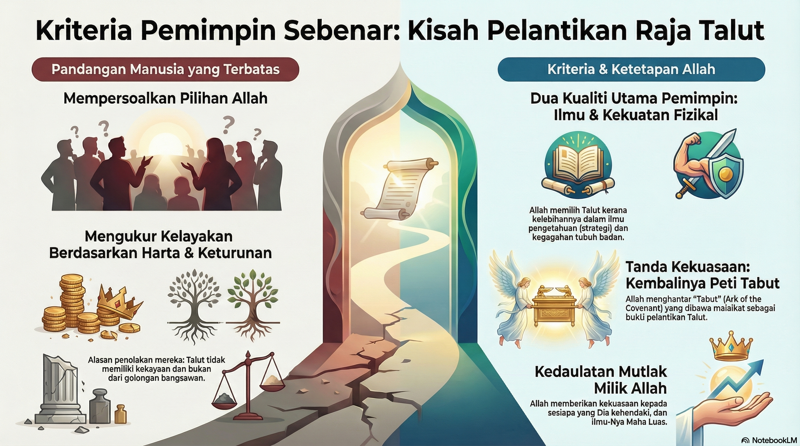 Ini mengajar kita, kalau memilih pemimpin berdasarkan kepada keturunan dan kekayaan, memang akan punah. Kerana ini cara Bani Israil memilih pemimpin mereka dan kita pun tahu mereka ini dijadikan contoh perkara yang buruk-buruk.