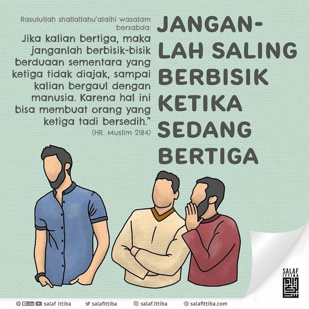 Daripada Ibnu Mas’ūd رضي الله عنه, beliau berkata: Rasulullah ﷺ bersabda, “Jika kalian bertiga, maka janganlah dua orang berbicara/berbisik-bisik berduaan sementara yang ketiga tidak diajak, sampai kalian berbaur kembali dengan manusia kerana perbuatan ini akan membuat orang yang ketiga tadi bersedih.”