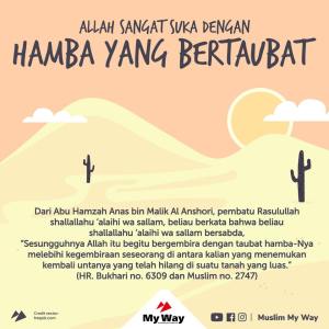 “Sesungguhnya Allah sangat gembira dengan taubat hamba-Nya ketika dia bertaubat pada-Nya melebihi kegembiraan seseorang di antara kalian yang berada di atas kenderaannya dan berada di suatu tanah yang luas (padang pasir), kemudian haiwan yang ditungganginya lari meninggalkannya. Padahal di haiwan tunggangannya itu ada bekalan makan dan minumnya. Sehingga dia pun menjadi putus asa. Kemudian dia mendatangi sebuah pohon dan tidur berbaring di bawah naungannya dalam keadaan hati yang telah berputus asa. Tiba-tiba ketika dia dalam keadaan seperti itu, kenderaannya tampak berdiri di sisinya, lalu dia mengambil ikatnya. Kerana sangat gembiranya, maka dia berkata, ‘Ya Allah, Engkau adalah hambaku dan aku adalah Rabb-Mu.’ Dia telah salah mengucapkan kerana sangat gembiranya.”