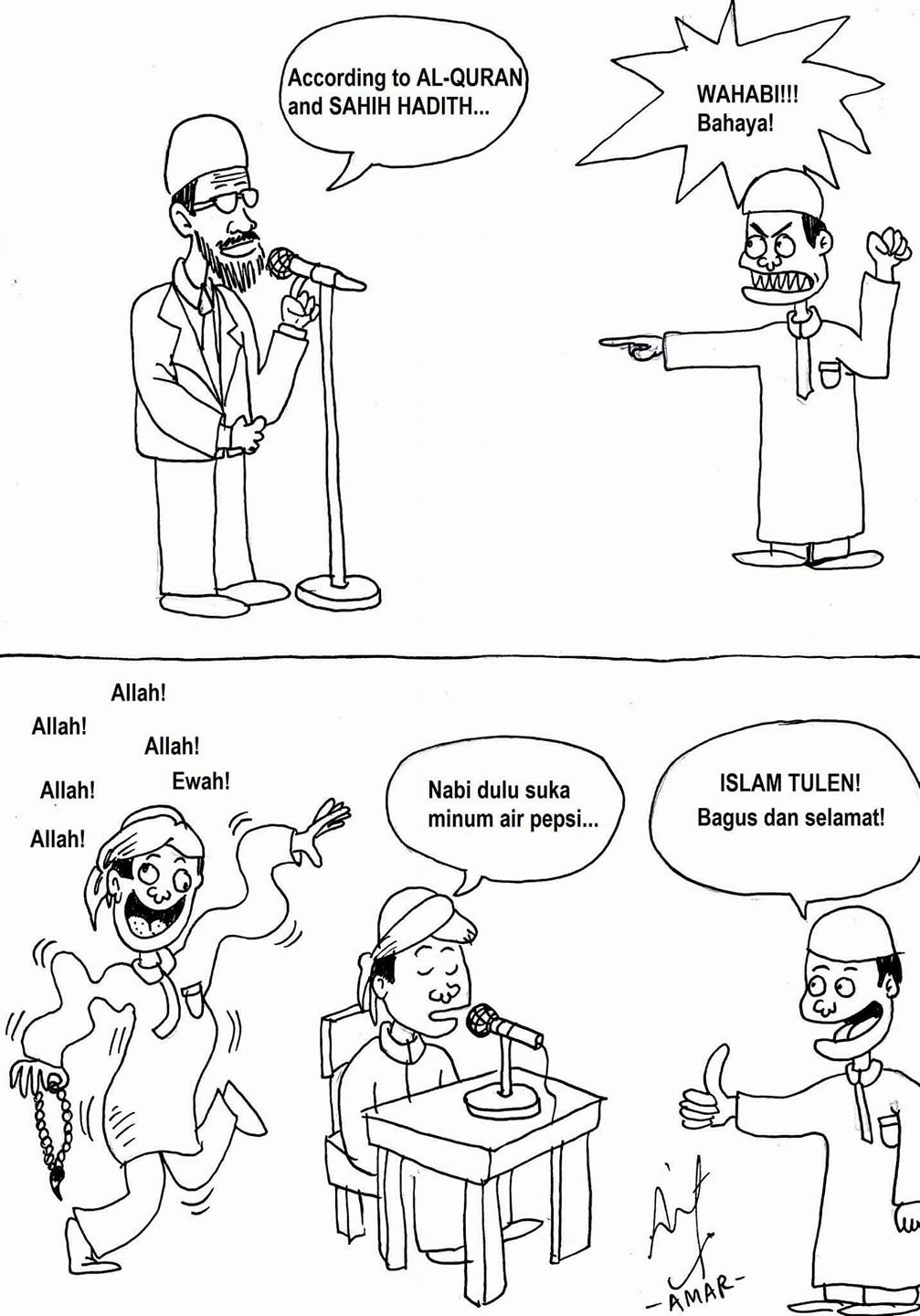 Maka anak-anak murid yang jahil juga teruslah tolak kalau ada ustaz yang mengajar ada sedikit perbezaan daripada ustaz mereka ajar. Mereka pun berzikirlah wahabi, wahabi, wahabi tidak tentu pasal. Bila tanya apakah wahabi, mereka pun tidak boleh jawab melainkan: “Entah, tapi ustaz aku kata depa tu WAHABI. Bahaya!”.