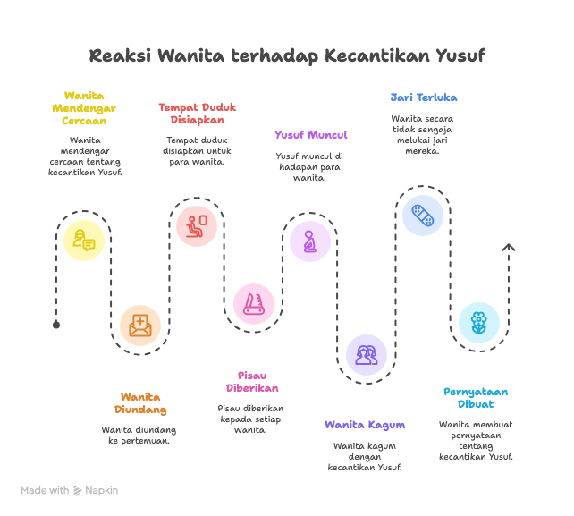 Maka tatkala wanita itu mendengar cercaan mereka, diundangnyalah wanita-wanita itu dan disediakannya bagi mereka tempat duduk, dan diberikannya kepada masing-masing mereka sebuah pisau (untuk memotong jamuan), kemudian dia berkata (kepada Yusuf): “Keluarlah (nampakkanlah dirimu) kepada mereka”. Maka tatkala wanita-wanita itu melihatnya, mereka kagum kepada (keelokan rupa)nya, dan mereka melukai (jari) tangannya dan berkata: “Maha sempurna Allah, ini bukanlah manusia. Sesungguhnya ini tidak lain hanyalah malaikat yang mulia”.