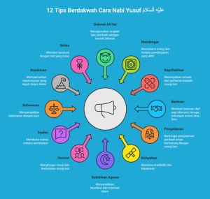 1. Dakwah bil Hal. Perawakan pendakwah perlu dijaga supaya akhlak kita sendiri menjadi dakwah. Ia akan memudahkan mad’u menerima dakwah kita. Kadangkala tidak bercakap pun orang sudah lembut hati untuk mengikut kita. Dua orang banduan itu berasa yakin dengan perawakan Nabi Yusuf عَلَيْهِ ٱلسَّلَامُ sampaikan mereka berkata إِنَّا نَرَٮٰكَ مِنَ ٱلۡمُحۡسِنِينَ (Sesungguhnya kami memandangmu: daripada orang-orang yang berbuat kebaikan) kerana baginda memang banyak membantu orang lain.