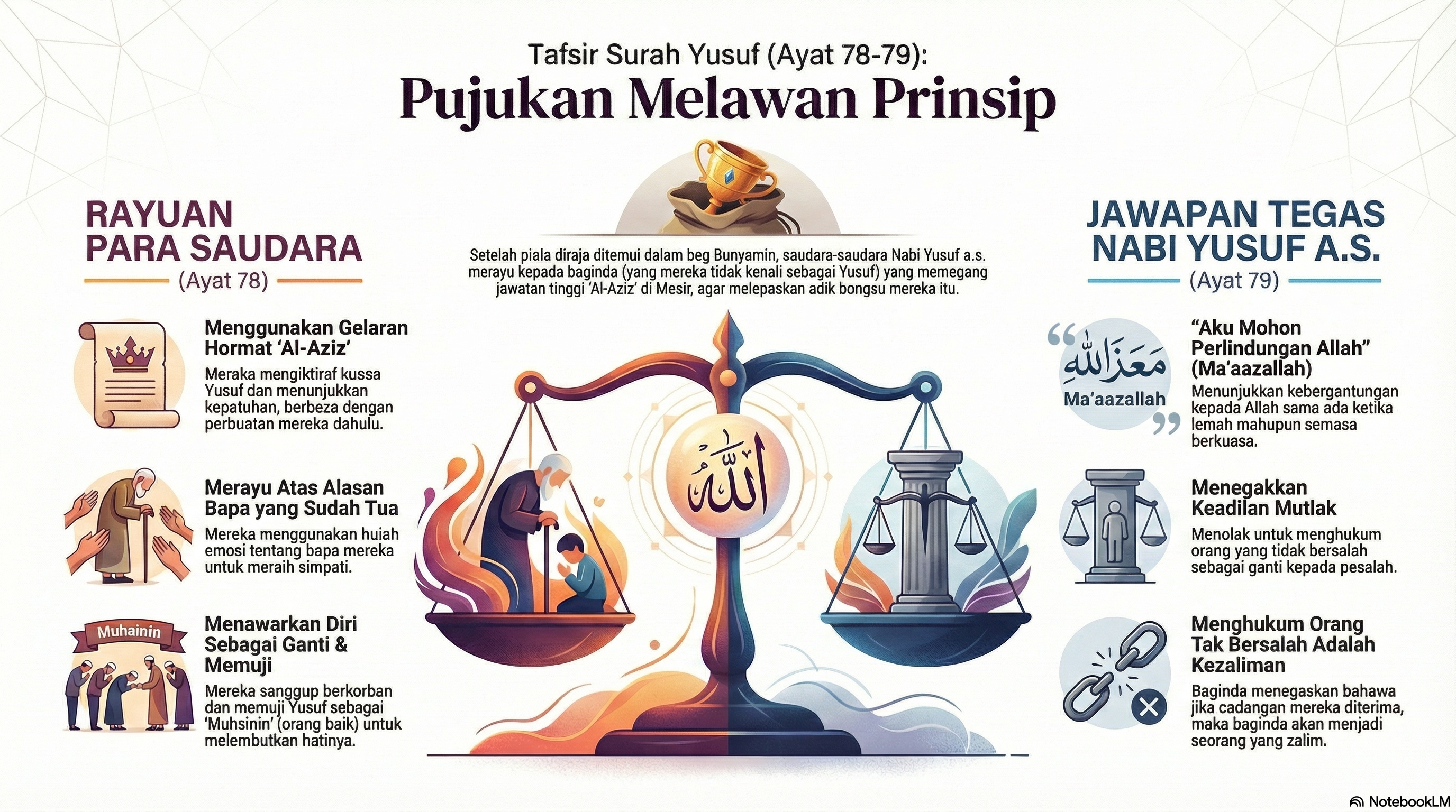 Yusuf Ayat 78: Dalam masa yang sama, mereka bimbang dan takut apa yang akan berlaku dengan perkara itu. Mereka terkenang yang mereka sudah berjanji dengan bapa mereka untuk menjaga adik mereka dan membawanya pulang dengan selamat. Maka mereka memujuk Nabi Yusuf عَلَيْهِ ٱلسَّلَامُ untuk melepaskan adik mereka itu.