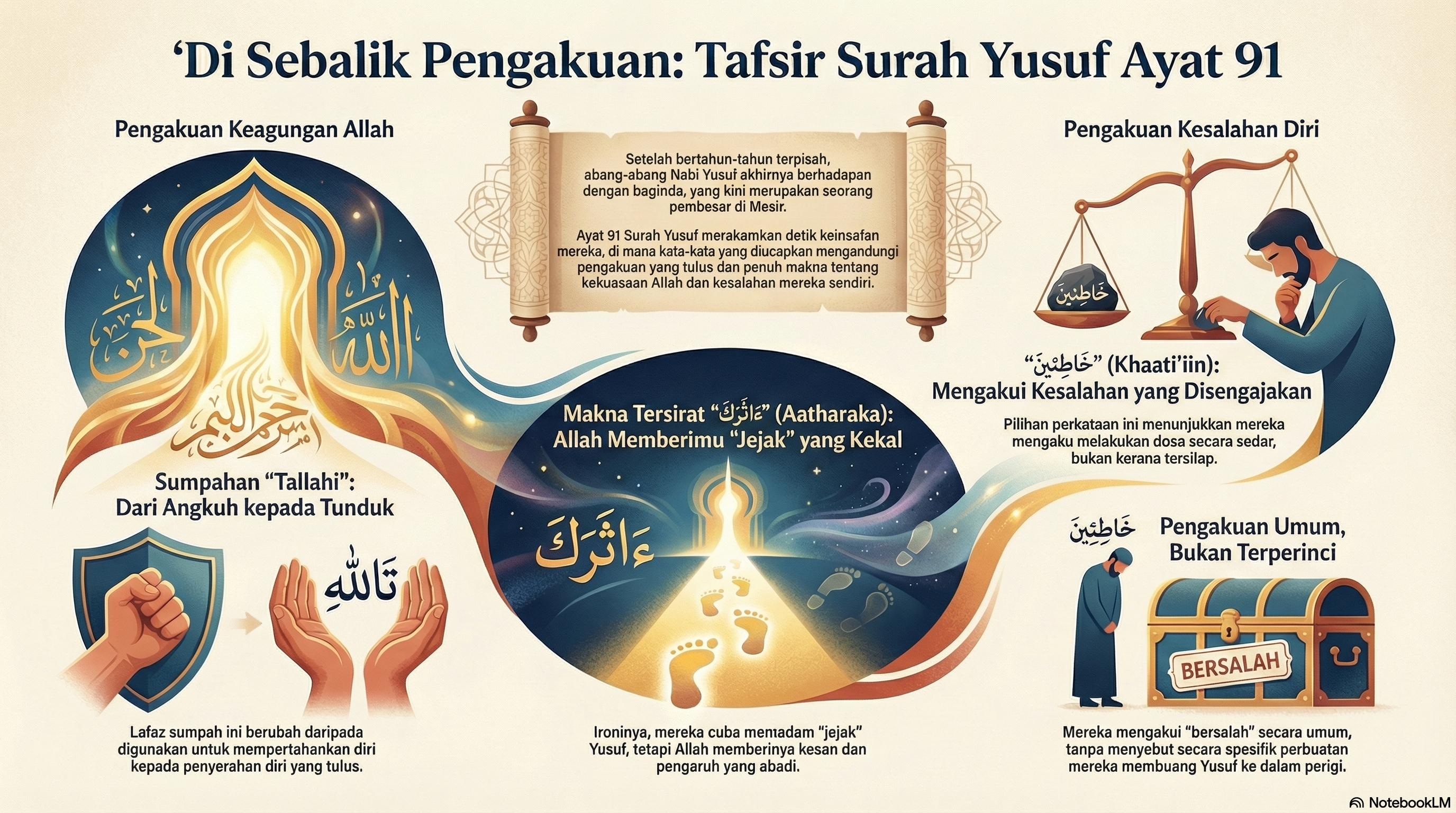Yusuf Ayat 91: Maka terkejutlah abang-abang Nabi Yusuf itu. Mereka tidak ada pilihan lain dari mengaku kesalahan yang mereka telah pernah lakukan terhadap baginda dan adik mereka Bunyamin. Maka sekarang kita akan lihat komen dan tindakbalas mereka. Sebenarnya tidaklah mereka hanya berkata-kata pendek ini sahaja, tentu lagi banyak mereka bercakap kerana mereka pun ramai. Akan tetapi di sini Allah hanya muatkan kata-kata yang penting sahaja. Walaupun kata-kata mereka itu pendek sahaja, tapi kita akan kupas dan cuba menggali apakah maksud di sebalik kata-kata itu.