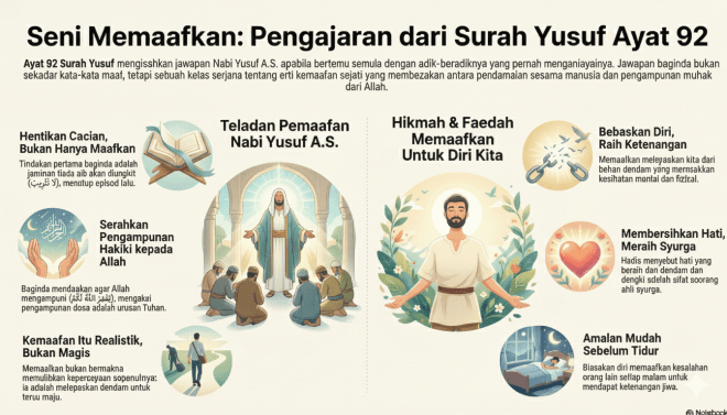 Yusuf Ayat 92: Betapa sukarnya proses memaafkan, terutamanya apabila ia melibatkan pengkhianatan yang datang daripada orang yang paling kita percayai? Pertemuan semula Nabi Yusuf A.S. dengan adik-beradiknya selepas berpuluh tahun terpisah bukanlah sekadar satu babak yang dramatik. Ia adalah sebuah kelas sarjana yang mengandungi pelajaran yang mendalam dan tidak dijangka tentang sifat sebenar kemaafan—satu proses yang jauh lebih kompleks daripada sekadar ucapan “saya maafkan kamu”. Mari kita lihat apakah jawapan balas dari Nabi Yusuf عليه السلام dan pengajaran yang kita boleh ambil darinya.