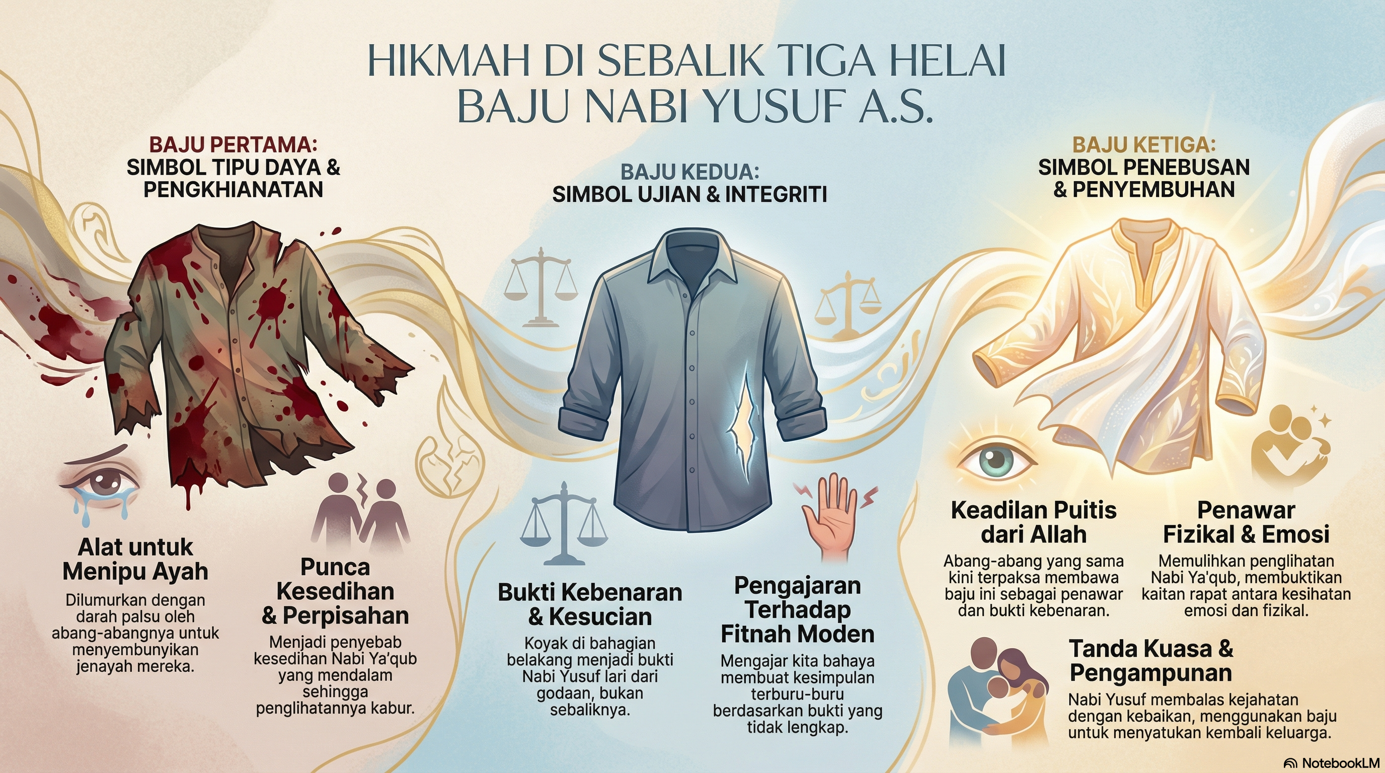 1. Tiga helai baju Nabi Yusuf masing-masing menjadi saksi kepada episod penting dalam hidupnya. Baju pertama dilumur darah palsu sebagai simbol pengkhianatan abang-abangnya. Baju kedua yang koyak di belakang menjadi bukti kesuciannya dalam ujian godaan, manakala baju ketiga menjadi penawar dan simbol penebusan serta penyatuan semula keluarga.