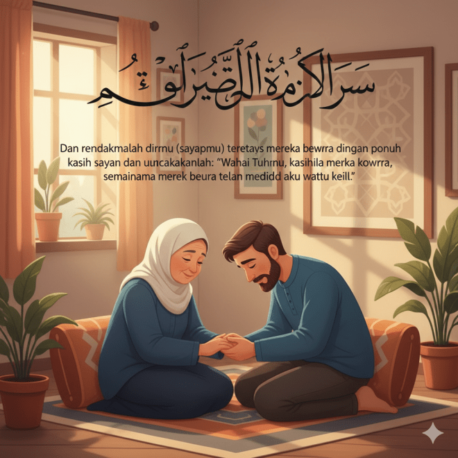 Dan rendahkanlah dirimu terhadap mereka berdua dengan penuh kesayangan dan ucapkanlah: “Wahai Tuhanku, kasihilah mereka keduanya, sebagaimana mereka berdua telah mendidik aku waktu kecil”.