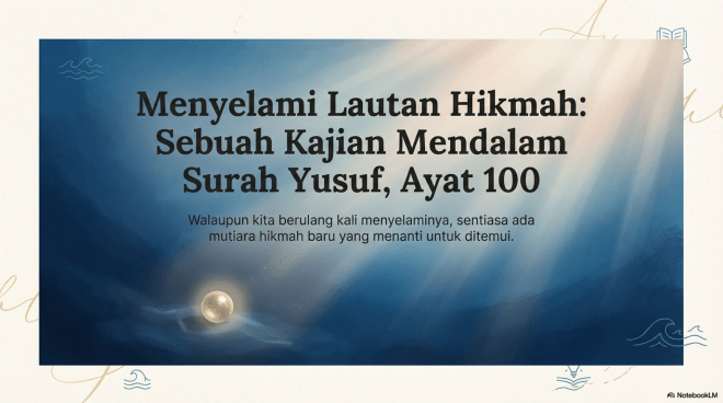 Tulisan ini cuba mendedahkan beberapa pengajaran yang berwawasan dan mungkin mengejutkan, yang digali daripada perbincangan mendalam tentang satu ayat sahaja (Ayat 100) dari Surah Yusuf. Ini membuktikan betapa luasnya kebijaksanaan yang terkandung dalam kalam Allah, di mana renungan yang teliti boleh membuka pintu kepada pemahaman yang tidak pernah kita jangkakan. Ia mengingatkan kita tentang satu hakikat yang indah: …pada akhirnya, walaupun setelah menghabiskan seumur hidup merenungi Al-Qur’an, kita akan menyedari bahawa kita hanya mampu membawa pulang beberapa titisan hikmahnya; kita tidak akan sekali-kali dapat memiliki seluruh lautan itu…