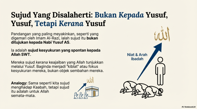 Analogi yang mudah untuk memahaminya adalah seperti ibadah kita di Kaabah: kita tidak sujud kepada Kaabah; kita sujud menghadap Kaabah, dan sujud itu adalah untuk Allah semata-mata. Begitulah juga, keluarga Nabi Ya’qub AS sujud kepada Allah. Nabi Yusuf AS menjadi “kiblat” atau fokus yang menyebabkan mereka melahirkan kesyukuran yang begitu meluap-luap sehingga mereka tersungkur sujud. Pandangan ini juga menyelesaikan dilema teologi yang besar: bagaimana mungkin seorang Nabi yang begitu memuliakan bapanya akan membenarkan bapanya sendiri sujud kepadanya? Jawapannya, baginda tidak membenarkannya, kerana sujud itu sebenarnya adalah untuk Allah, bukan kepada baginda.