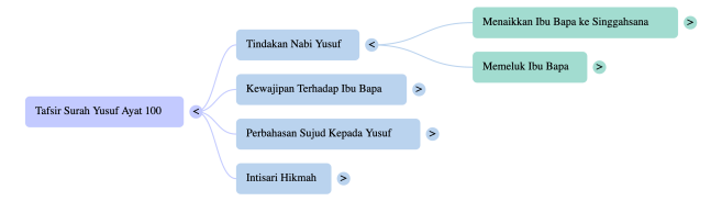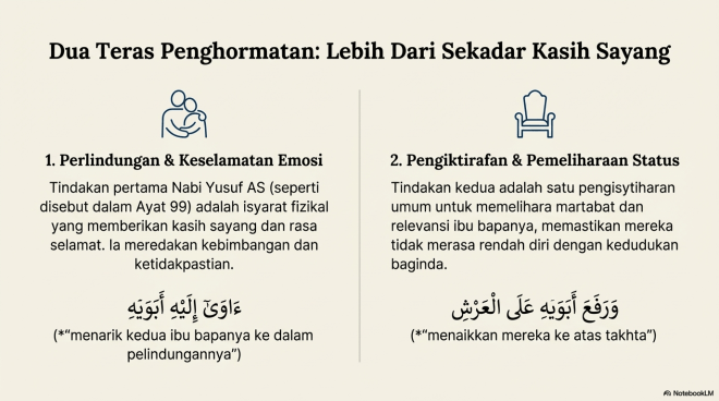 1. Dua peringkat penghormatan tersebut ialah: pertama, tindakan fizikal “menarik kedua ibu bapanya ke dalam pelindungannya” (ءَاوَىٰٓ إِلَيهِ أَبَوَيهِ) untuk memberikan kasih sayang dan rasa selamat. Kedua, tindakan “menaikkan mereka ke atas takhta” (وَرَفَعَ أَبَوَيهِ عَلَى العَرشِ) untuk menangani kebimbangan mereka tentang status dan relevansi, memastikan mereka sentiasa merasa mulia dan dihormati.