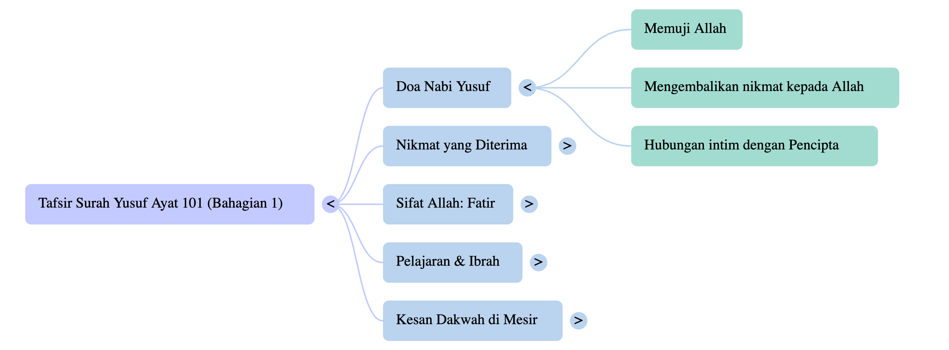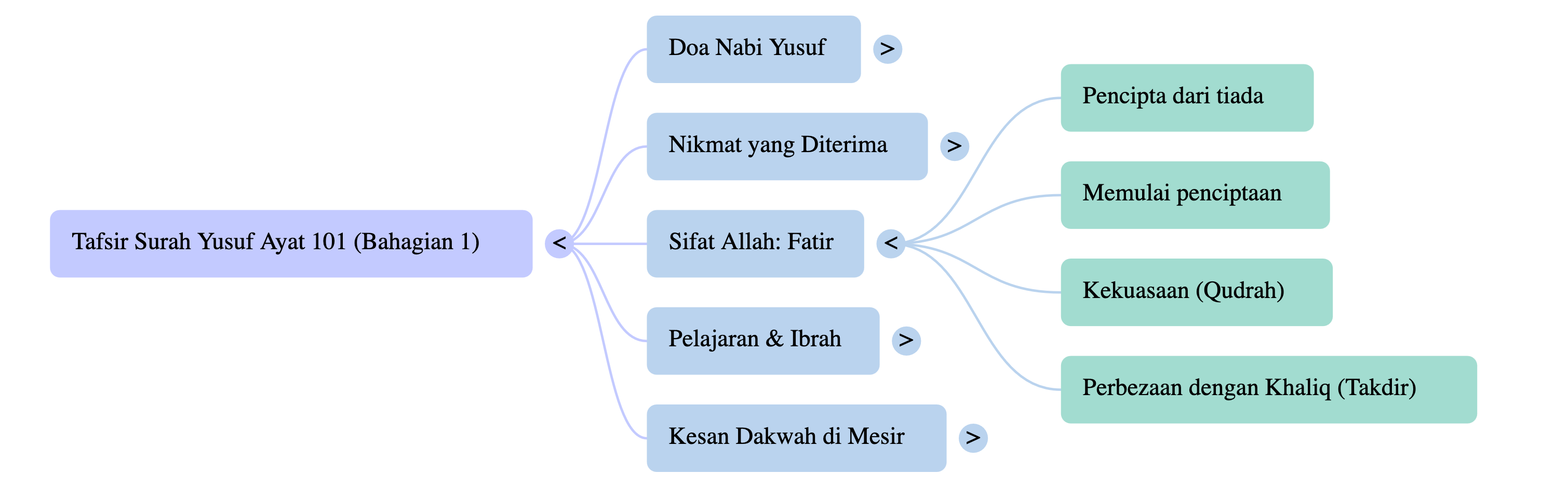 Yusuf Ayat 101: Kita sampai ke ayat terakhir dalam bab cerita Nabi Yusuf di dalam surah ini. Sekarang baginda memuji lagi Allah ﷻ. Segala apa kelebihan yang baginda dapat, baginda pulangkan kepada Allah ﷻ – semua itu dari Allah ﷻ. Begitulah yang kita dapat belajar dari Nabi Yusuf عليه السلام ini; bila ada masalah, baginda rujuk kepada Allah ﷻ dan bila senang pun, begitu juga baginda kembalikan kepada Allah ﷻ.
