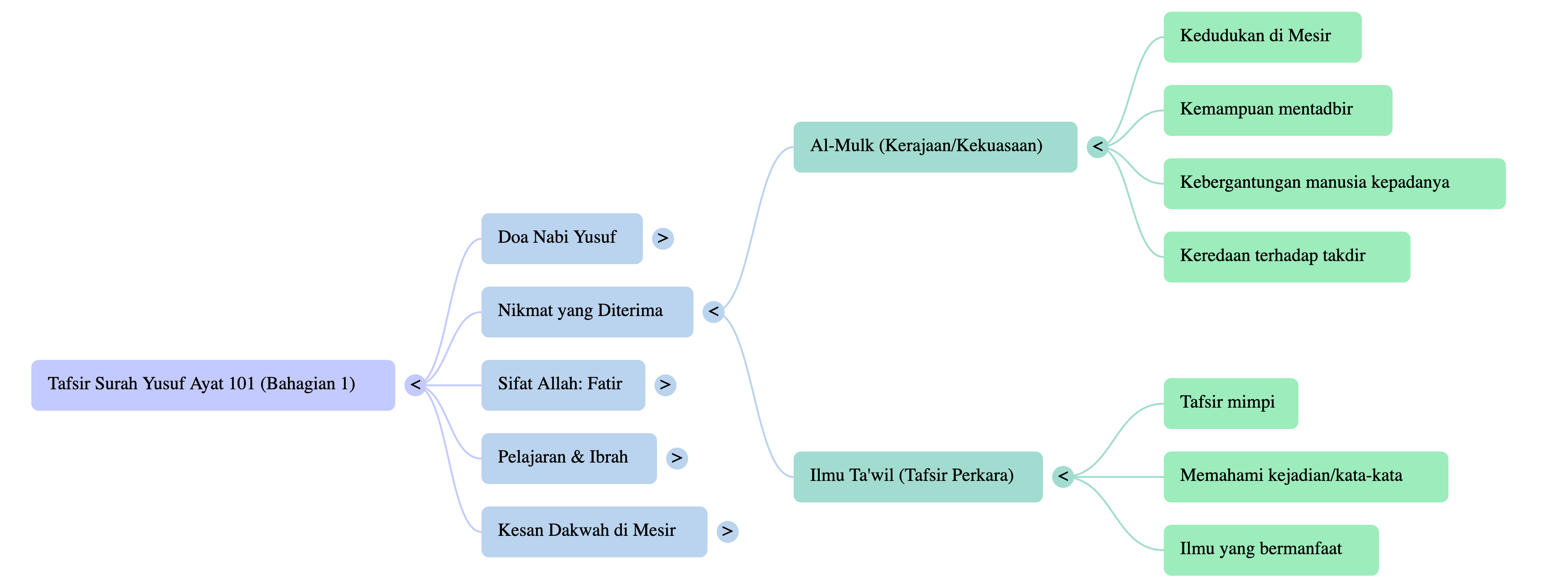 Jadi Nabi Yusuf telah menyebut dua nikmat yang telah diberikan kepada baginda: Kerajaan & ilmu ta’wil mimpi. Kaitan antara dua perkara itu, sebagaimana dijelaskan para mufassir, adalah bahawa Allah menganugerahkan kepada Nabi Yusuf dua nikmat besar: kekuasaan (kedudukan/kerajaan) dan ilmu (khususnya ilmu menakwil mimpi). Kedua nikmat ini menjadi sebab utama kemuliaan dan keberhasilan Nabi Yusuf di dunia, serta menjadi jalan untuk menegakkan keadilan dan menyebarkan kebaikan. Penting baginda ada kedua-duanya sekali. Kerana kalau Allah hanya beri baginda ilmu sahaja, tapi tidak diberikan kuasa, baginda pun tidak boleh menzahirkan ilmu itu supaya ia bermanfaat kepada manusia. Kalau baginda ada kuasa sahaja, baginda pun tidak boleh buat apa-apa kerana baginda tidak ada ilmu.