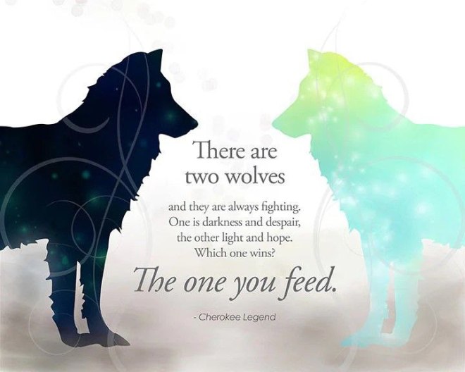 Sebagaimana ada pepatah Inggeris menarik berkenaan bisikan dalaman hati manusia yang dikiaskan dengan perebutan kuasa dan pertengkaran di antara dua ekor serigala yang lapar; seekor serigala yang penuh kegelapan dan putus asa sementara yang seekor lagi penuh dengan cahaya dan harapan. Yang mana satukah akan menang? Tentulah yang kita berikan makanan.