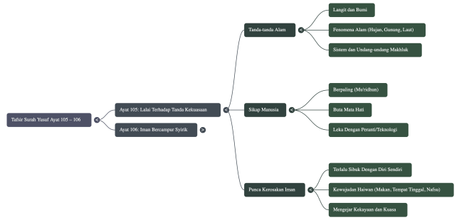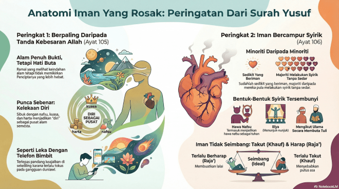 Yusuf Ayat 105: Ayat syikayah (rungutan) dari Allah. Pernahkah anda terfikir bagaimana iman seseorang boleh rosak secara senyap tanpa disedari? Atau mengapa ada orang yang kelihatan percaya kepada Tuhan, tetapi cara hidup mereka seolah-olah jauh dari-Nya? Jawapan kepada persoalan rumit ini mungkin tersembunyi di dalam Surah Yusuf, khususnya dalam ulasan ayat 105 hingga 107. Ayat-ayat ini mendedahkan apa yang boleh kita panggil sebagai “anatomi iman yang rosak” — satu proses menurun yang menunjukkan bagaimana kepercayaan yang tulen boleh tercemar dari dalam.