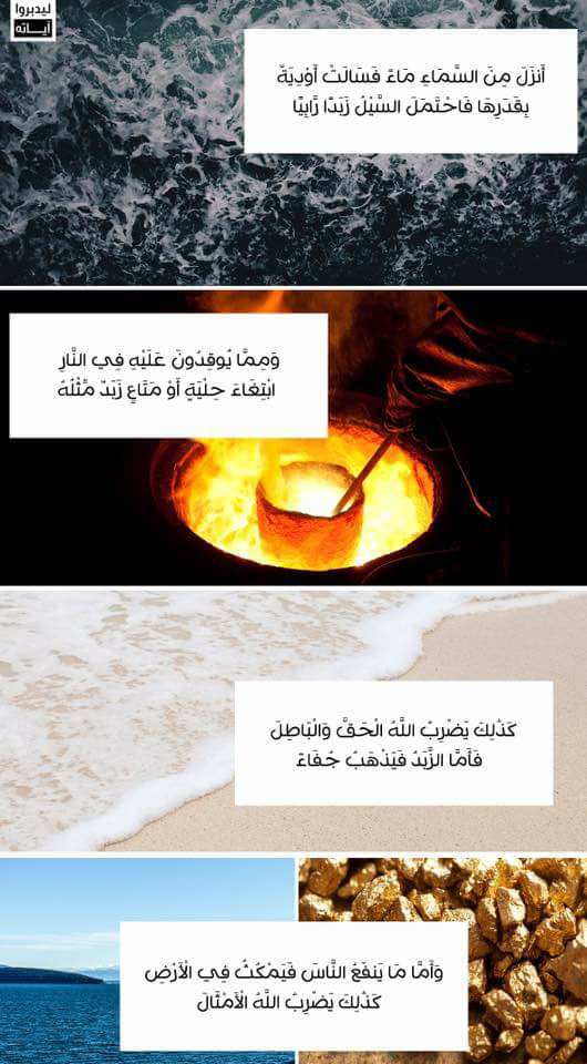 أَنزَلَ مِنَ السَّماءِ ماءً فَسالَت أَودِيَةٌ بِقَدَرِها فَاحتَمَلَ السَّيلُ زَبَدًا رّابِيًا ۚ وَمِمّا يوقِدونَ عَلَيهِ فِي النّارِ ابتِغاءَ حِليَةٍ أَو مَتٰعٍ زَبَدٌ مِّثلُهُ ۚ كَذٰلِكَ يَضرِبُ اللهُ الحَقَّ وَالبٰطِلَ ۚ فَأَمَّا الزَّبَدُ فَيَذهَبُ جُفاءً ۖ وَأَمّا ما يَنفَعُ النّاسَ فَيَمكُثُ فِي الأَرضِ ۚ كَذٰلِكَ يَضرِبُ اللهُ الأَمثالَ