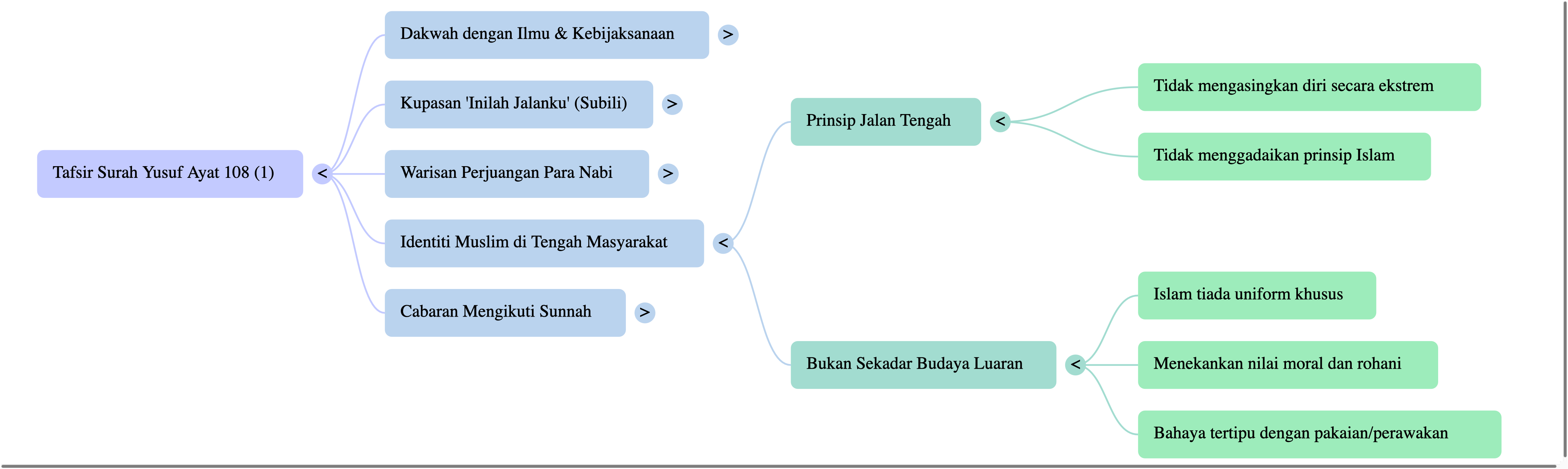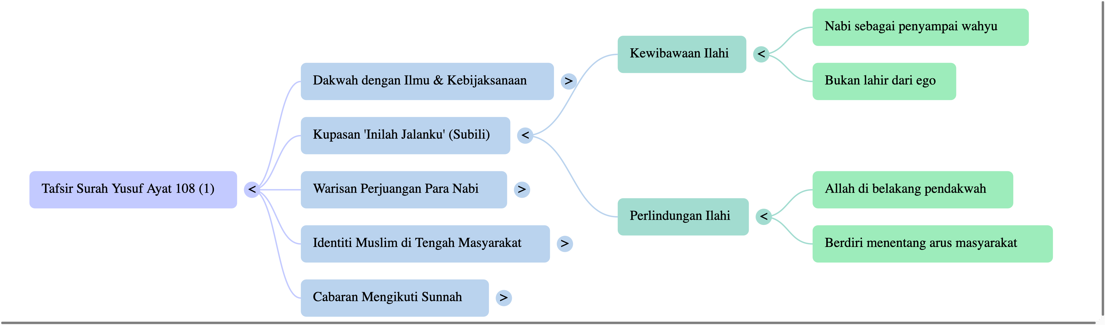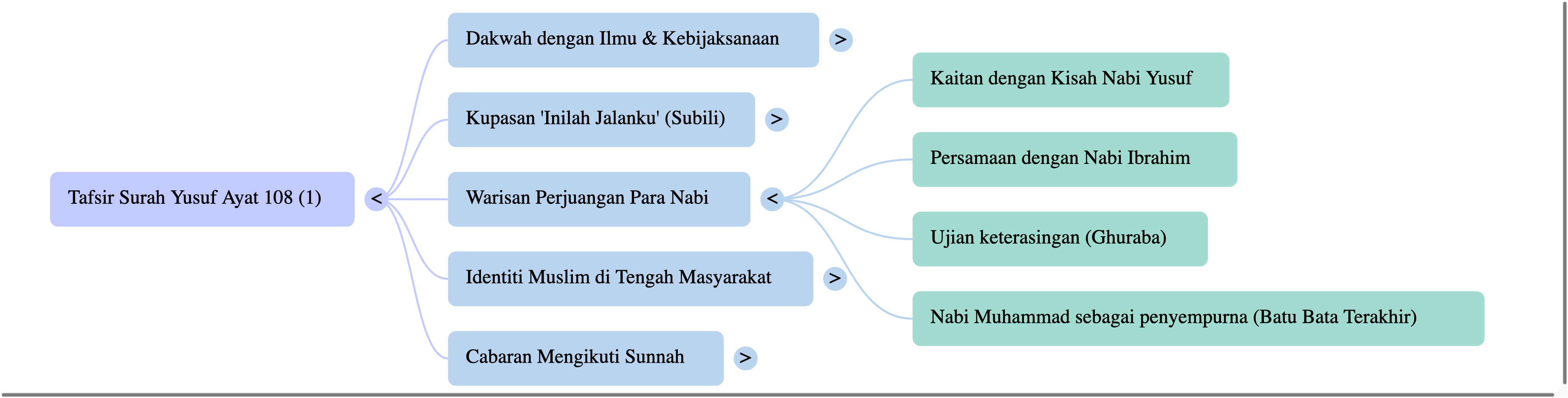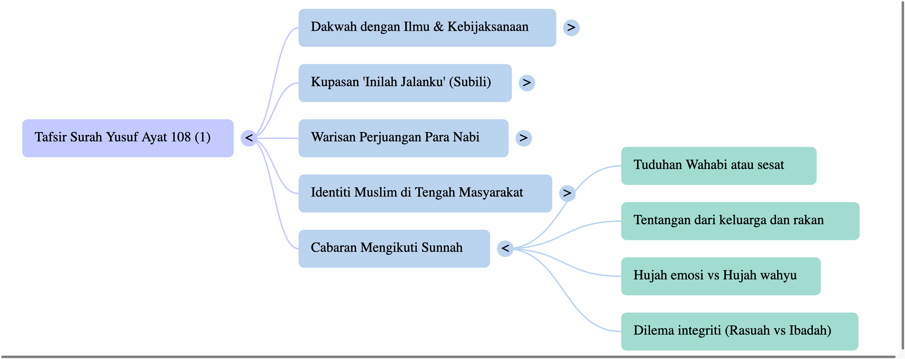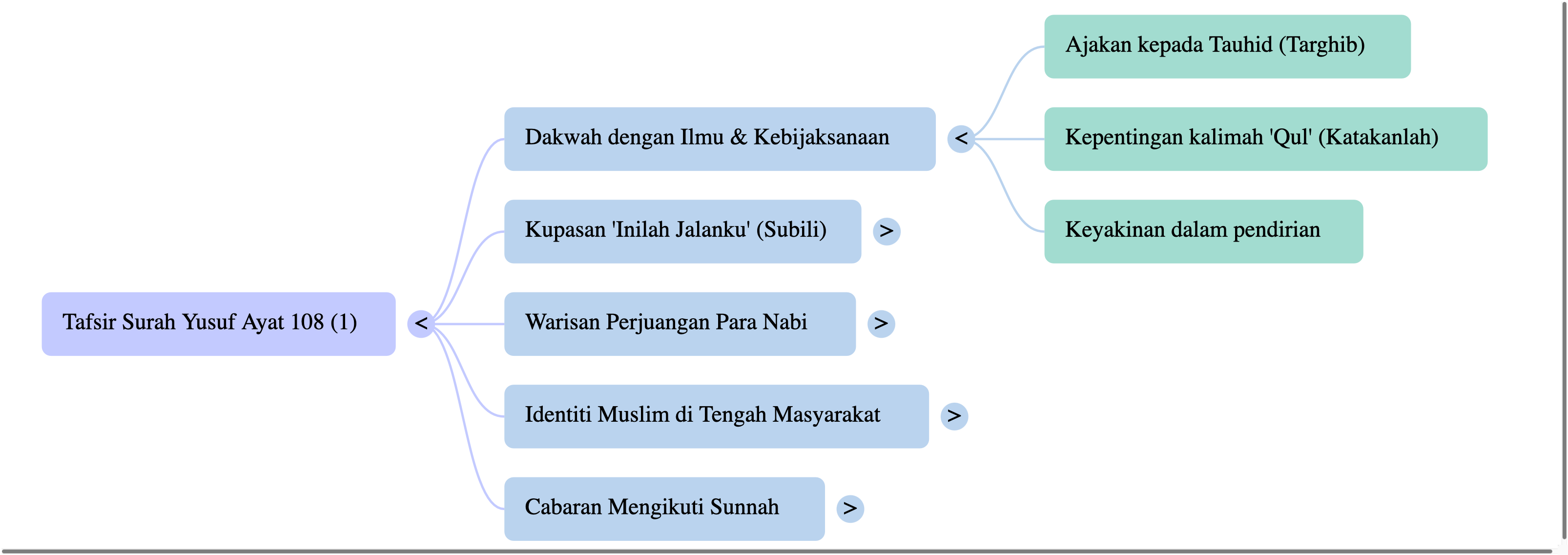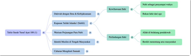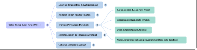 Yusuf Ayat 108: Ayat ini adalah salah satu ayat yang mungkin ayat terpenting di dalam surah ini. Ia pendek, tapi mengandungi banyak pengajaran di dalamnya yang kita harap kita boleh telusuri. Kita takkan dapat memahami keseluruhan darinya kerana setiap ayat adalah seperti satu lautan yang dalam yang kita tidak akan dapat menggalinya. Kalau kita perhatikan ahli tafsir, atau para asatizah yang menyampaikan tafsir Al-Qur’an, kita boleh perhatikan mereka menyampaikan perkara yang berbeza-beza. Mereka tidak berselisih, tapi setiap dari mereka melihat satu-satu ayat itu dari perspektif yang berbeza. Kerana itu kalau kita dapat mengambil dari banyak kupasan, pemahaman kita akan lebih mendalam.