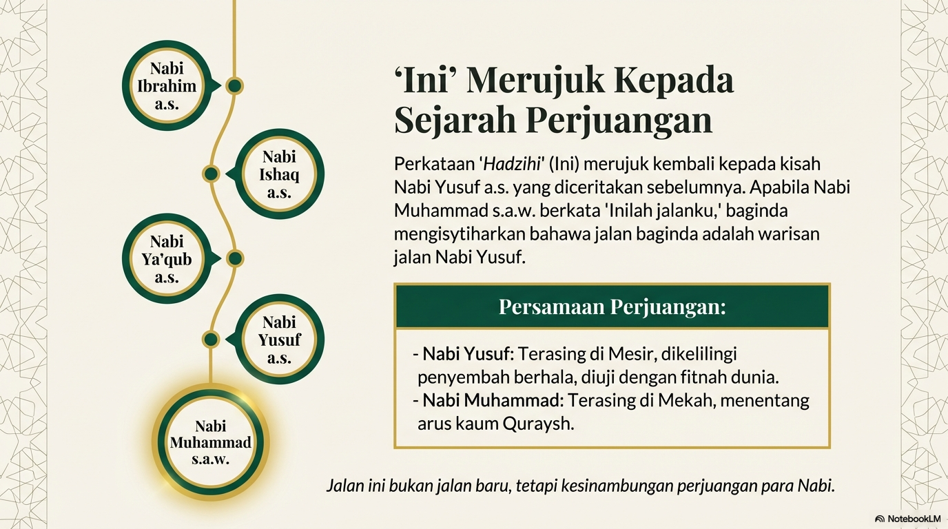 Perkataan “ini” (هَـٰذِهِۦ) dalam ayat ini boleh ditafsirkan sebagai rujukan kepada sesuatu yang telah berlalu. Memandangkan ayat ini berada di penghujung Surah Yusuf, “Ini” seolah-olah merujuk kepada keseluruhan kisah Nabi Yusuf a.s. yang baru sahaja diceritakan tidak lama sebelum ini. Apabila Nabi Muhammad s.a.w. berkata, “Inilah jalanku,” baginda seolah-olah menyatakan, “Kisah perjuangan Yusuf itu adalah jalanku juga.” Sebagaimana Nabi Yusuf diuji di dalam menegakkan agama Allah, Nabi Muhammad juga begitu. Kedua-dua mereka di dalam perjalanan menuju Allah. Walaupun kisah Nabi Yusuf itu berlaku ribuan tahun dahulu, tapi ia sama sahaja dari segi perjalanan mereka.