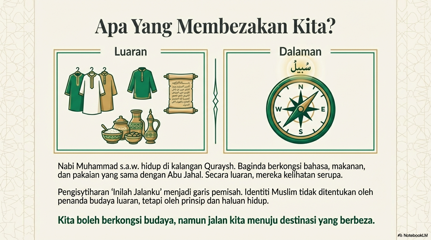 Identiti Muslim tidak ditentukan oleh penanda budaya luaran seperti pakaian, bahasa, atau jenis makanan. Sebaliknya, ia ditentukan oleh keyakinan moral dan rohani yang membentuk prinsip serta haluan hidup yang berteraskan wahyu.
