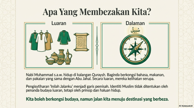 Ini mengajar kita bahawa identiti seorang Muslim tidak ditentukan oleh penanda budaya luaran; bukan pakaian, bahasa, atau resepi makanan. Bukan juga bahasa yang dituturkan. Sebaliknya, ia ditentukan oleh keyakinan moral dan rohani yang membentuk prinsip dan haluan hidupnya.