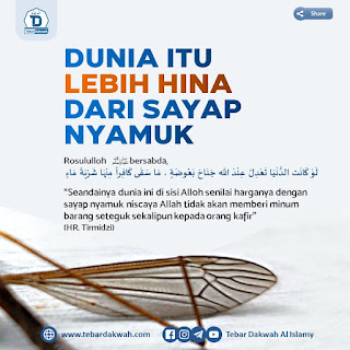 Daripada [Sahl bin Sa’ad رَضِيَ اللّٰهُ عَنْهُ] dia berkata bahawa Rasulullah ﷺ bersabda: “Seandainya dunia itu di sisi Allah sebanding dengan sayap nyamuk tentu Allah tidak mahu memberi orang orang kafir walaupun hanya seteguk air.”