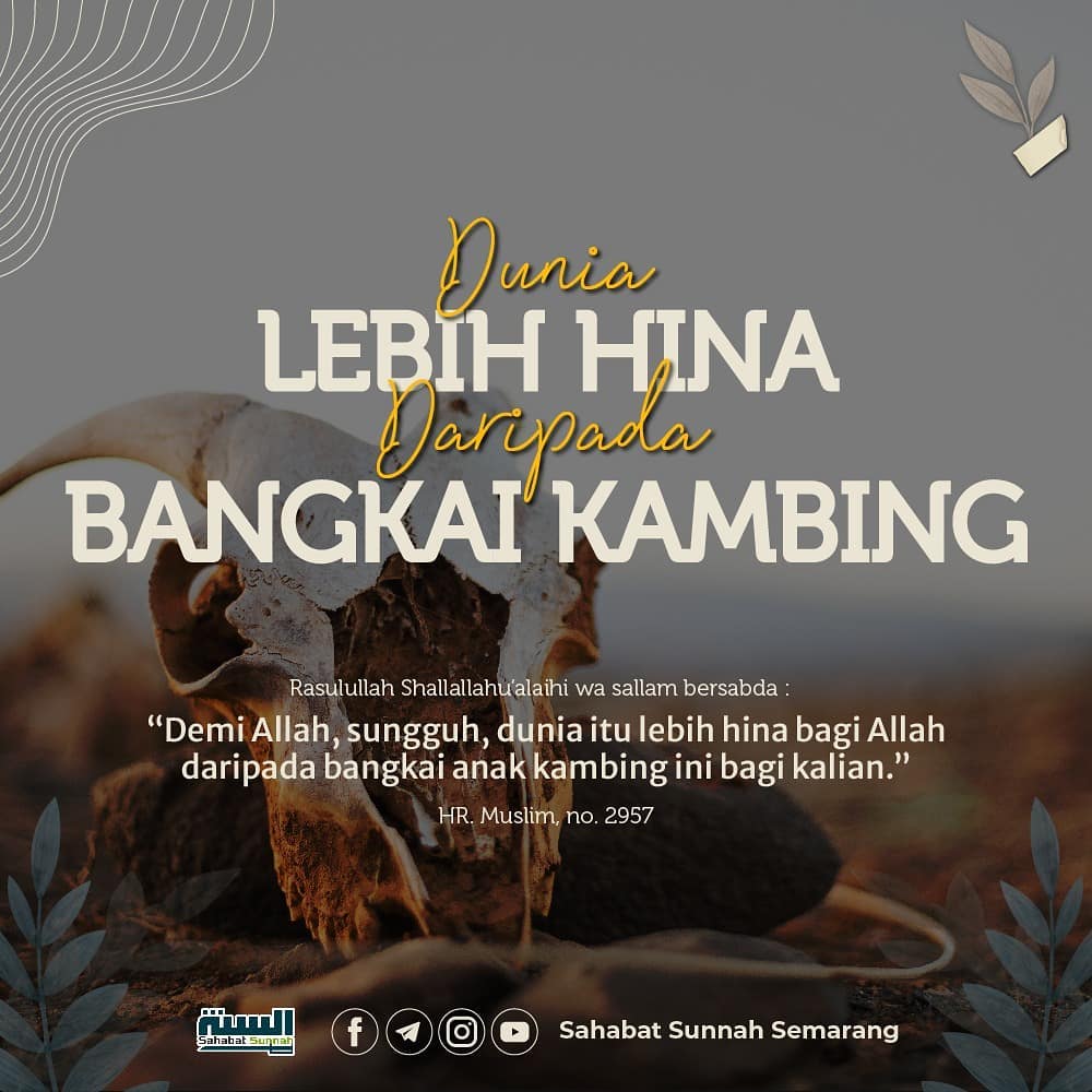 Daripada [Jabir bin Abdullah رَضِيَ اللَّهُ عَنْهُمَا], Rasulullah ﷺ melintas masuk ke pasar selepas pergi dari tempat-tempat tinggi sementara orang-orang berada di sisi baginda. Baginda melintasi bangkai anak kambing dengan telinga melekat, baginda mengangkat telinganya lalu bersabda: “Siapa di antara kalian yang mahu membeli ini seharga satu dirham?” Mereka menjawab: Kami tidak mahu memilikinya, untuk apa? Baginda bersabda: “Apa kalian mahu (bangkai) ini milik kalian?” Mereka menjawab: Demi Allah, andai masih hidup pun ada cacatnya kerana telinganya menempel, lalu bagaimana halnya dalam keadaan sudah mati? Baginda bersabda: “Demi Allah, dunia lebih hina bagi Allah melebihi (bangkai) ini bagi kalian.”