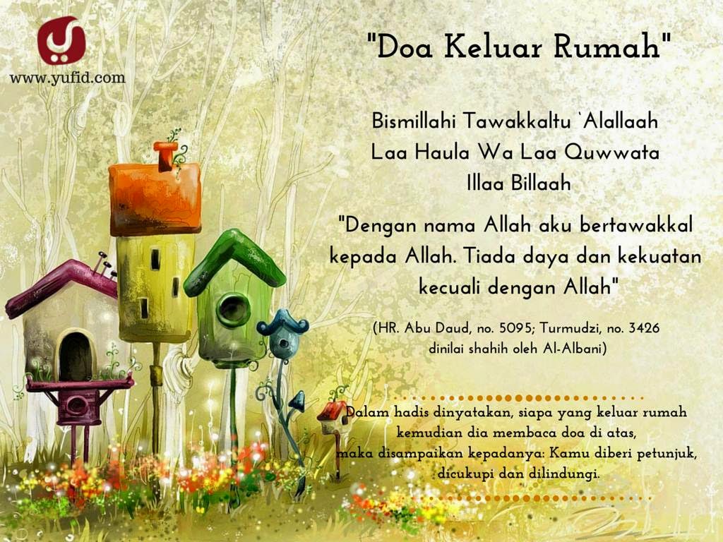 Dari [Anas bin Malik رَضِيَ اللّٰهُ عَنْهُ] bahawa Nabi ﷺ bersabda: “Jika seorang laki-laki keluar dari rumahnya lalu mengucapkan: ‘BISMILLAHI TAWAKKALTU ‘ALAALLAHI LAA HAULA WA LAA QUWWATA ILLA BILLAH (Dengan nama Allah aku bertawakal kepada Allah, tidak ada daya dan kekuatan kecuali dengan izin Allah). ‘ Beliau bersabda: “Maka pada saat itu akan dikatakan kepadanya, ‘Kamu telah mendapat petunjuk, telah diberi kecukupan dan mendapat penjagaan’, hingga syaitan-syaitan menjauh darinya. Lalu syaitan yang lainnya berkata, “Bagaimana (engkau akan menggoda) seorang laki-laki yang telah mendapat petunjuk, kecukupan dan penjagaan.”