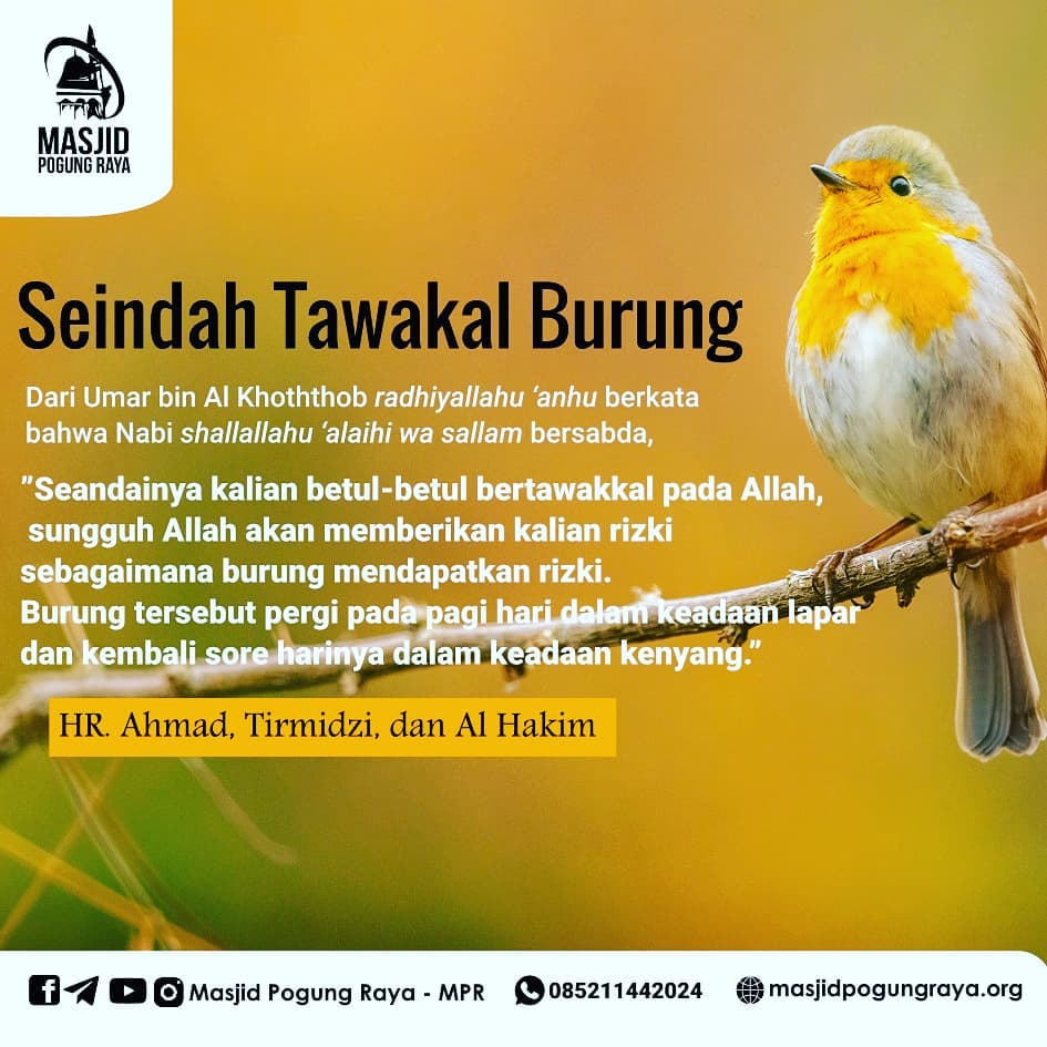 “Seandainya kamu semua benar-benar bertawakal pada Allah, sungguh Allah akan memberikan kamu rezeki sebagaimana burung mendapatkan rezeki. Burung tersebut pergi pada pagi hari dalam keadaan lapar dan kembali petang harinya dalam keadaan kenyang.”