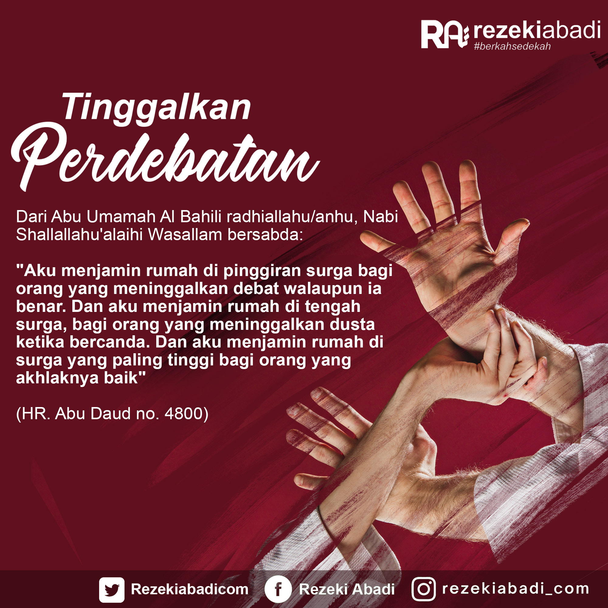 Daripada [Abu Umamah رَضِيَ اللّٰهُ عَنْهُ] dia berkata, “Rasulullah ﷺ bersabda: “Aku akan menjamin rumah di tepi syurga bagi seseorang yang meninggalkan perdebatan meskipun benar. Aku juga menjamin rumah di tengah syurga bagi seseorang yang meninggalkan kedustaan meskipun bersifat gurau, dan aku juga menjamin rumah di syurga yang paling tinggi bagi seseorang yang berakhlak baik.